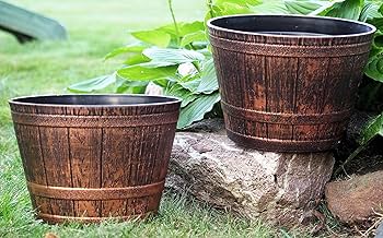 Large Whiskey Barrels Set Of 2 Rustic Look 2 Planters 2 Matching Saucers French Country Style Flowerpot Indoor Outdoor Garden Patio Office Home Decor Use Reusable Light Weight Copper Patio Lawn Garden Amazon Com